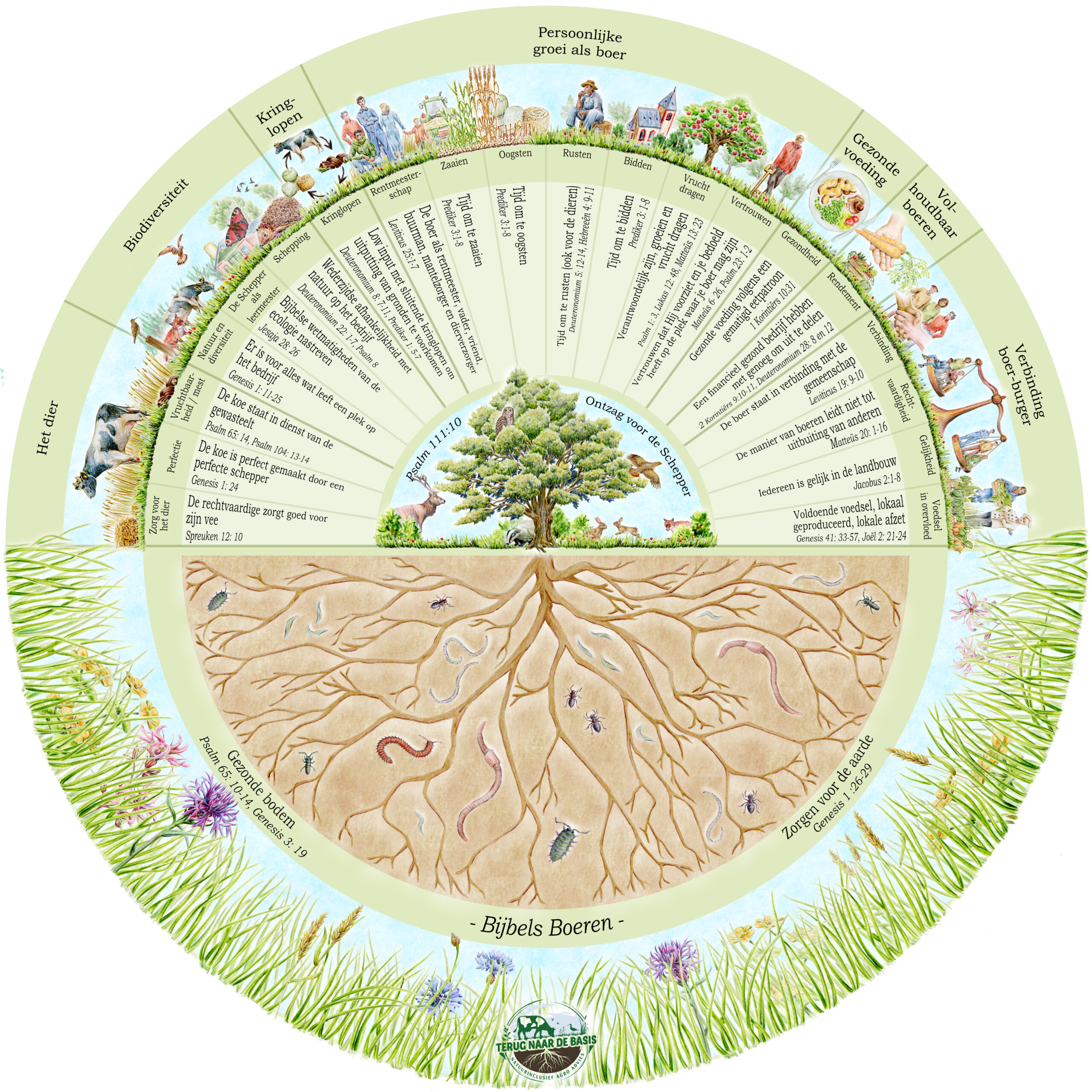 Ik hoop dat onderstaande cirkel jou als kapitein (boer) inzicht geeft hoe de Bijbel kijkt naar verschillende thema’s op en rondom het boerenbedrijf. Het is een praatplaat om eens te bespreken tijdens een studieavond met boeren, in de plaatselijke kerk of bij een goed gesprek in het gezin over de toekomst van het bedrijf.